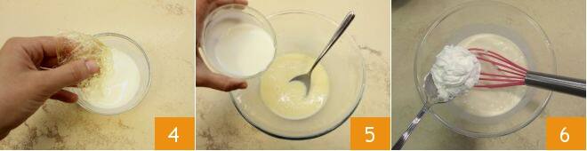 Chauffez les 50 g de crème restants, puis égouttez soigneusement la gélatine et placez-la dans la crème encore chaude 3, mélangez jusqu'à dissolution complète. Ajoutez la crème dans laquelle vous avez dissous la gélatine au lait concentré aromatisé 4, mélangez pendant environ 5 minutes. Ensuite, ajoutez petit à petit la crème montée au mélange, en mélangeant avec un fouet 6.