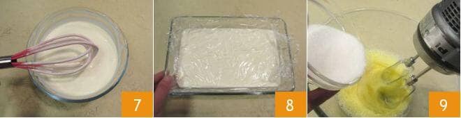 Une fois prêt 7, mettez la crème obtenue dans un plat peu profond et couvrez d'un film alimentaire au contact 8, placez au réfrigérateur pendant une heure. Passez à la pâte biscuit au cacao : dans un bol, versez les œufs et le sucre en poudre, commencez à monter le mélange avec un batteur électrique 9 (vous pouvez également utiliser un robot si vous le souhaitez).