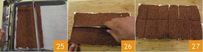 Une fois que le gâteau a raffermi, retirez le cadre réglable 25 et transférez le gâteau sur une planche à découper, coupez en deux dans le sens de la longueur 26 puis transversalement pour obtenir les tranches. Les tranches de cacao au lait sont prêtes à être dégustées 27 !