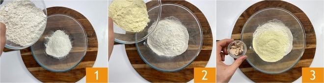 Pour préparer la tresse avec pesto et tomates cerises, commencez par la pâte. Dans un bol, versez la farine 1, la semoule 2 et la levure de bière émiettée 3.