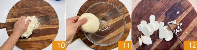 Transférez ensuite sur un plan de travail 10 et continuez à pétrir jusqu'à obtenir une pâte lisse et homogène 11. Couvrez de film plastique et laissez lever pendant environ 2 heures et demie, jusqu'à ce que la pâte ait doublé de volume. Quelques minutes avant, occupez-vous de couper la scamorza en dés 12.