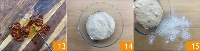 Coupez également les tomates cerises bien égouttées en morceaux 13. Dès que la pâte est bien levée 14, transférez-la sur un plan de travail légèrement fariné 15.