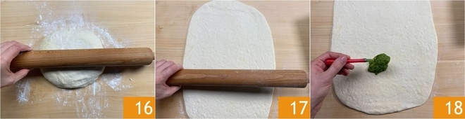 Farinez également un peu la pâte 16 et étalez-la pour obtenir un rectangle d'environ 1 cm d'épaisseur 17. Versez le pesto sur la pâte 18 et étalez-le de manière à couvrir presque toute la surface 18.
