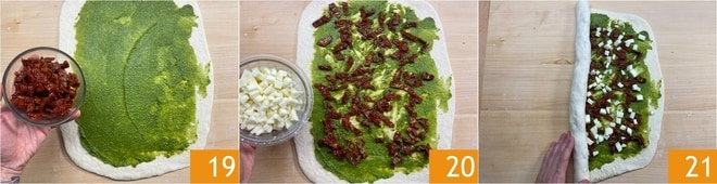 Disposez sur le pesto également les tomates séchées 19 et la scamorza 20. Roulez du côté long 21.
