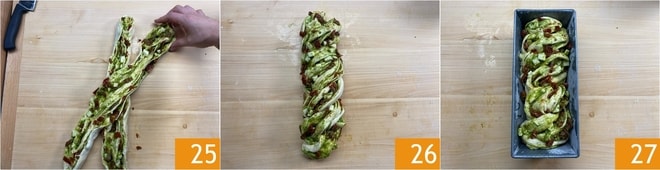 Superposez les deux parties 25 et enroulez-les pour obtenir une tresse 26. Transférez-la à l'intérieur d'un moule à cake de 25x12 cm, recouvert de papier sulfurisé 27.