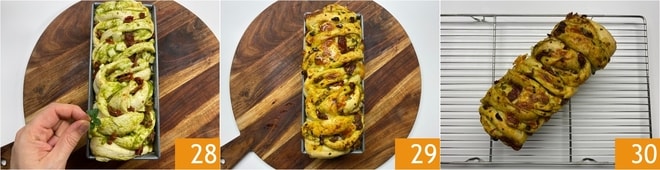 Laissez lever encore une heure, puis parsemez de flocons de sel et de feuilles d'origan 28. Faites cuire au four statique préchauffé à 180° jusqu'à ce qu'elle soit bien dorée. Ensuite, sortez la tresse du four 29, attendez quelques minutes et transférez-la sur une grille 30. Laissez refroidir et servez 30.