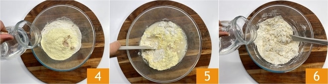 Ajoutez une partie de l'eau 4 et commencez à mélanger avec une cuillère 5. Ajoutez ensuite encore de l'eau 6 et mélangez.