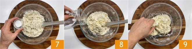 Ajoutez enfin le sel 7 et l'eau restante 8. Pétrissez à la main dans le bol 9.