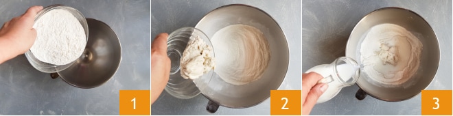 Pour réaliser les tresses aux noix et chocolat, versez la farine dans le bol d'un robot équipé d'un crochet 1, ajoutez le levain 2 et versez le lait 3, mettez en marche le robot et commencez à travailler le mélange.