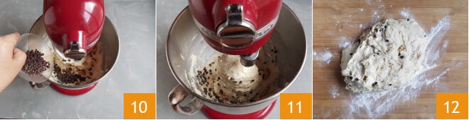 Enfin, ajoutez également les pépites de chocolat 10, travaillez quelques instants pour les incorporer 11. Transférez la pâte sur un plan de travail légèrement fariné 12.