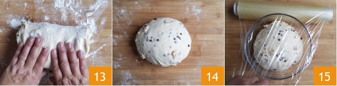 Pétrissez à la main 13 pour former une boule 14 et placez-la dans un bol. Couvrez avec un film plastique et laissez lever pendant au moins 4 heures à l'abri des courants d'air 15.