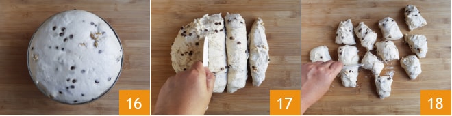 Reprenez la pâte qui aura doublé de volume 16 et divisez-la en 12 parts égales en vous aidant d'une corne 17 18.