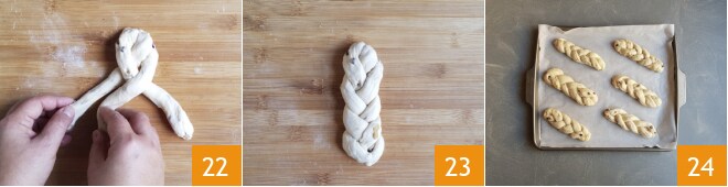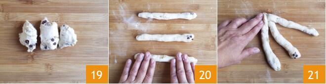 Prenez chaque morceau et divisez-le à son tour en trois parts égales 19. Avec chaque petit morceau, formez un brin d'environ 20 cm de long 20. Superposez les extrémités en pressant légèrement la pâte 21.