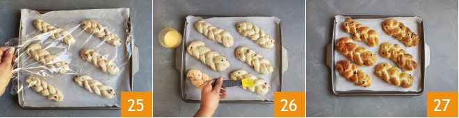 Couvrez avec du film alimentaire 25. Laissez lever les tresses pendant au moins 8 heures dans un endroit tiède. Passé ce temps, préparez un mélange de jaune d'œuf et de lait. Badigeonnez les tresses levées avec le mélange 26 et faites cuire au four préchauffé à 180 °C sur la grille du milieu en mode statique pendant environ 25 minutes. Sortez les tresses bien dorées du four et laissez-les refroidir complètement avant de les déguster 27.