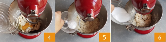 Incorporez l'œuf 4, le sel 5 et le sucre 6.