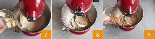Ensuite, ajoutez le beurre petit morceau par petit morceau 7, en incorporant le précédent avant d'ajouter le suivant. Travaillez au moins 10 minutes. Lorsque la pâte sera bien homogène 8, ajoutez les noix grossièrement hachées 9.
