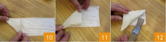 Repliez le triangle de droite à gauche et continuez à replier le triangle de manière alternée jusqu'à épuisement de la bande (10-11). Quand vous arriverez à la partie finale de la feuille de pâte phyllo, badigeonnez la partie restante avec un autre peu de beurre afin de bien sceller la fermeture du triangle 12. Continuez de la même manière pour tous les petits triangles.