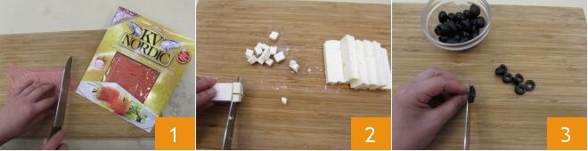 Pour préparer les petits triangles de pâte phyllo au saumon et crème de burrata, commencez par couper en fines lanières le saumon 1 que vous allez réserver dans un petit bol. Ensuite, prenez la feta : découpez-la en tranches, puis en petits cubes 2 et mettez-la de côté. Puis coupez les olives noires dénoyautées en petits morceaux très fins 3 et mettez-les également de côté.