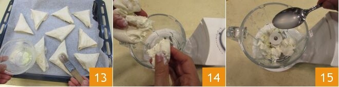 Disposez-les sur une plaque recouverte de papier sulfurisé : badigeonnez la surface de beurre fondu pour les rendre dorés à la cuisson 13 et enfournez dans un four statique préchauffé à 200°C pendant 15 minutes (si vous utilisez un four ventilé, ce sera suffisant à 180°C pendant environ 5-6 minutes). Pendant que les triangles cuisent, préparez la crème de burrata d'accompagnement. Prenez un mixeur et ajoutez-y des morceaux de burrata 14 : mélangez-la avec un peu d'eau de conservation du fromage 15 jusqu'à obtenir un mélange lisse et crémeux.