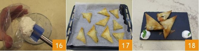 Transférez-le ensuite dans une poche à douille jetable 16 et décorez l'assiette avec la crème de burrata sur laquelle poser des feuilles de basilic. À ce stade, vos petits triangles de pâte phyllo au saumon et crème de burrata seront cuits : sortez-les du four 17 et présentez-les 18 : votre apéritif alternatif est servi !