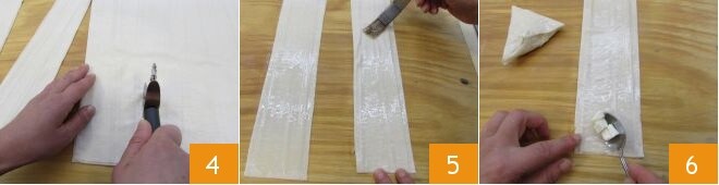 Prenez maintenant la pâte phyllo, superposez une feuille sur l'autre et découpez des bandes d'environ 8-10 cm de large 4 : prenez une bande de pâte phyllo (vous pouvez la badigeonner de beurre fondu pour la rendre plus croustillante à la cuisson) 5, commencez par l'un des côtés les plus courts et disposez des cubes de feta 6.