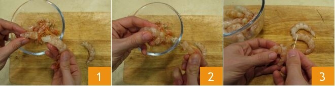 Pour les 4 canapés avec tartare de crevettes: nettoyez les crevettes en les décortiquant (1-2), puis incisez le dos et retirez l'intestin, le fil noir, en vous aidant éventuellement d'un cure-dent 3: répétez cette opération pour la dose de crevettes de toute la recette.