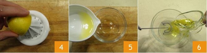 Pressez le jus du citron et versez-le dans un petit bol (4-5); ajoutez également l'huile en filet en émulsionnant avec un fouet à main 6. Ajoutez aussi le sel et le poivre à votre goût.