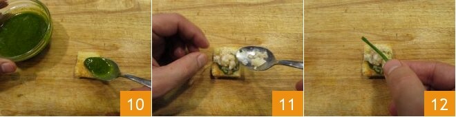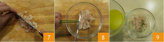 Hachez ensuite 4 crevettes parmi celles nettoyées 7 et versez-les dans un autre petit bol; hachez la ciboulette 8 et ajoutez l'émulsion d'huile et de citron aux crevettes hachées 9. Mettez de côté au réfrigérateur couvert de film plastique jusqu'au moment de l'utilisation.