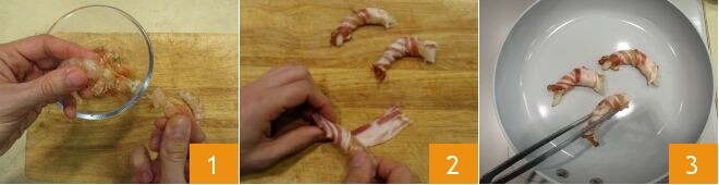 Pour les 4 canapés avec crevettes et lard: après avoir décortiqué les crevettes 1, enroulez-les dans les tranches de lard 2 et faites-les griller 1 minute de chaque côté dans une poêle antiadhésive 3 pour que le lard soit croustillant à l'extérieur.