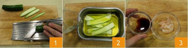 Pour les 4 canapés avec courgettes et crevettes: lavez et équeutez la courgette, puis tranchez-la avec une mandoline pour obtenir 4 tranches assez fines 1; placez-les dans un plat à gratin et faites-les mariner avec de l'huile, du vinaigre de cidre 2, du sel et du poivre. Après 10-15 minutes, vous pouvez bien égoutter les courgettes et les mettre de côté. Entre-temps, préparez aussi les crevettes: mettez 4 queues de crevette dans un petit bol, ajoutez la sauce soja 3