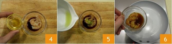 puis versez également le miel 4, le zeste et le jus de lime 5, les feuilles de thym. Vous pouvez faire caraméliser les crevettes à la poêle avec la marinade pendant quelques minutes seulement 6. Puis éteignez le feu et mettez les crevettes de côté.