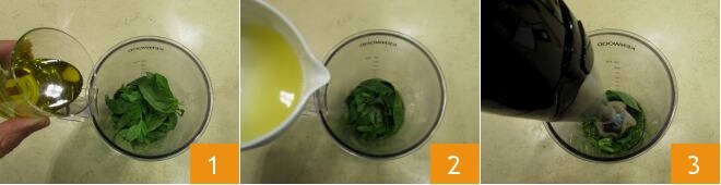 Pour les sauces d'accompagnement, commencez par la réduction au basilic: mettez les feuilles de basilic, ajoutez du sel, de l'huile 1 et du jus de citron 2; puis mixez le tout avec un mixeur plongeant 3.