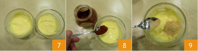 Divisez la dose de mayonnaise obtenue en deux petits bols 7 et aromatisez-en une avec le paprika 8 et l'autre avec le gingembre en poudre 9.