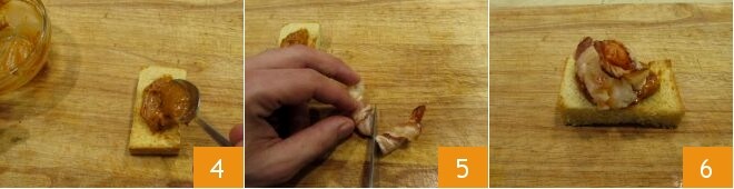 Pour les 4 canapés avec crevettes et lard: garnissez la surface du pain brioché avec la mayonnaise au paprika 4, vous pouvez diviser les crevettes si vous préférez 5 et les déposer sur le pain brioché 6.
