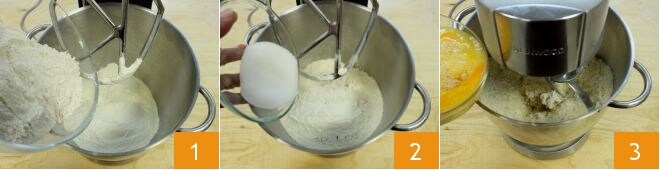 Pour réaliser le trio de canapés de pain brioché aux crevettes, commencez par le pain brioché: versez les farines tamisées dans le bol d'un robot muni d'une feuille 1. Ajoutez la levure déshydratée (vous pouvez aussi utiliser de la levure de boulanger fraîche: dans ce cas, la dose à utiliser est de 6 g), le sucre 2 et les œufs petit à petit 3.