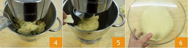 Ajoutez également l'eau à température ambiante 4, puis mettez la feuille en marche à vitesse moyenne. Lorsque les ingrédients seront bien rassemblés autour de la feuille, arrêtez le robot, remplacez la feuille par le crochet et remettez la machine en marche; ajoutez le sel et le beurre ramolli à température ambiante en petits morceaux peu à peu 5, en attendant qu'un morceau soit absorbé avant d'en ajouter un autre. Laissez la pâte s'accrocher au crochet jusqu'à ce qu'elle soit lisse et homogène. Transférez la pâte sur le plan de travail et travaillez-la pour lui donner une forme sphérique. Mettez-la dans un grand bol, couvrez-la de film plastique 6 et laissez-la lever pendant au moins 30 minutes dans le four éteint avec la lumière allumée.