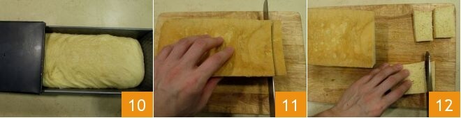 Après le temps nécessaire, fermez le moule avec le couvercle pour obtenir une forme plus rectangulaire (sinon laissez-le découvert et le pain brioché aura plus de poussée à la cuisson, il sera plus haut) 10. Faites cuire dans un four statique préchauffé à 170°C pendant 30 minutes (si four ventilé à 150°C pendant 20 minutes). Une fois cuit, sortez-le du four et laissez tiédir, puis démoulez-le et laissez-le refroidir complètement sur une grille. Une fois froid, tranchez-le en tranches de 1,5 cm d'épaisseur 11, coupez une fine bande latérale pour former un rectangle 12