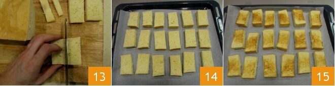 puis divisez-le en deux 13: il vous en faudra 12 au total (avec le pain brioché restant, vous pourrez réaliser des biscuits ou des croûtons savoureux à servir avec une soupe par exemple!). Disposez-les sur une plaque recouverte de papier sulfurisé 14 et faites-les griller sous le gril à 240°C pendant trois minutes (veillez à ce que les rectangles de pain brioché dorent sans brûler, vous pouvez les retourner à mi-cuisson) 15. Une fois prêts, sortez-les du four et laissez-les refroidir.