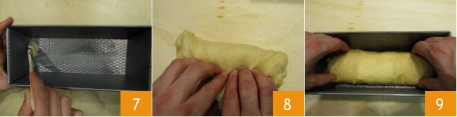 Beurrez un moule rectangulaire de 26x11,5 cm 7. Puis reprenez la pâte et manipulez-la brièvement en réalisant des plis 8 et formez un boudin de la même taille que le moule. Placez le pain brioché dans le moule 9 et laissez-le lever encore 30 minutes couvert de film plastique (vous pouvez également le badigeonner d'œuf battu avec une cuillère de lait).