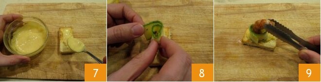 Pour les 4 canapés avec courgettes et crevettes: garnissez le pain brioché avec de la mayonnaise au gingembre 4, créez une rosace de courgettes en enroulant la tranche à la verticale 5 et déposez-y la crevette caramélisée 6. Ou enroulez simplement la queue de crevette avec la tranche de courgette.