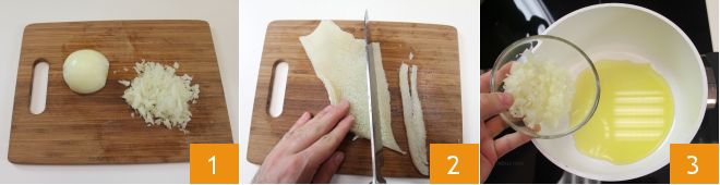Pour préparer les tripes à la parmesane, émincez finement l'oignon 2 et coupez les tripes en lamelles 2. Dans une grande casserole haute, faites rissoler l'oignon avec de l'huile d'olive extra vierge 3 et