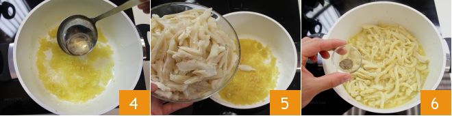 laissez-le fondre pendant une dizaine de minutes en ajoutant du bouillon de viande 4. Une fois que l'oignon est tendre, ajoutez les tripes 5 et faites-les rissoler pendant 5-6 minutes. Assaisonnez avec du sel et du poivre 6 et
