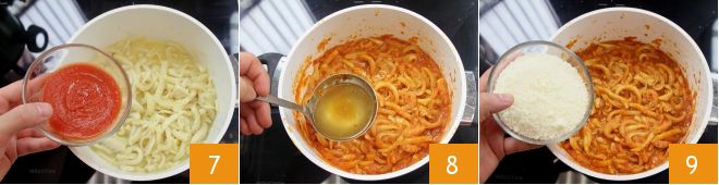 ajoutez la sauce tomate 7. Mélangez bien le tout et remuez avec une cuillère en bois, puis laissez cuire le tout sans couvercle à feu doux pendant environ 2 heures, en ajoutant de temps en temps une louche de bouillon de viande 8, afin que les tripes ne sèchent pas et restent tendres. À la fin de la cuisson, ajoutez le parmesan râpé 9, mélangez et servez vos tripes à la parmesane.