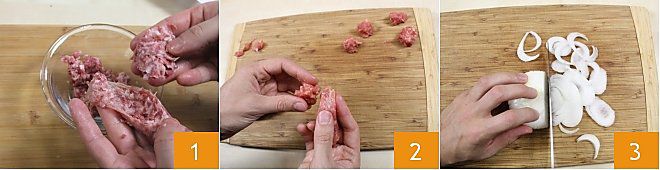 Pour préparer les bruschettas avec oignons et saucisse, commencez par émietter la saucisse : incisez le boyau de la saucisse avec la pointe d'un couteau bien aiguisé et retirez la peau 1. Après avoir formé des boulettes de saucisse 2, prenez l'oignon blanc et tranchez-le 3.