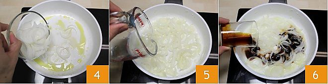 Chauffez un filet d'huile dans une poêle antiadhésive et ajoutez ensuite l'oignon tranché 4. Lorsque l'oignon commencera à dorer, ajoutez un demi-verre d'eau 5 et enfin le vinaigre balsamique 6, faites cuire pendant 5 minutes à feu doux.