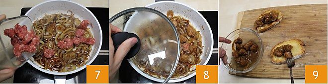 Une fois que l'oignon sera ramolli et coloré, ajoutez les boulettes de saucisse 7, couvrez la poêle avec un couvercle 8 et laissez cuire pendant 5 minutes supplémentaires. Ensuite, transférez les boulettes de saucisse et l'oignon sur les tranches de pain grillé, en les arrosant avec le jus au vinaigre balsamique formé pendant la cuisson 9. Vos bruschettas avec oignons et saucisse sont prêtes à être servies et dégustées encore chaudes !