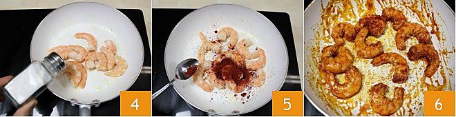 Salez à votre convenance 4 puis ajoutez le paprika 5, mélangez et laissez mijoter encore quelques secondes, jusqu'à ce que les crevettes soient colorées 6.