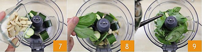Préparez maintenant le pesto de courgettes : lavez soigneusement la courgette et parez-la, puis coupez-la en rondelles assez épaisses et placez-les dans un mixeur. Ajoutez les amandes émondées 7, quelques feuilles de basilic 8 et versez un filet d'huile 9.