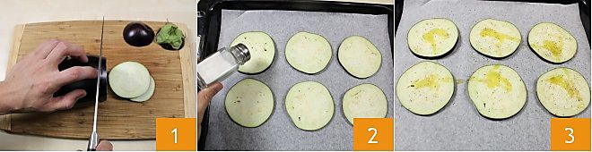 Pour préparer les bruschettas aux aubergines, burrata et tomates cerises, commencez par laver l'aubergine et la parer. Ensuite, coupez-la en tranches de 1 cm d'épaisseur 1 et transférez les tranches sur une plaque de cuisson recouverte de papier sulfurisé, salez-les 2 et versez un filet d'huile d'olive extra vierge sur chacune 3. À ce stade, enfournez dans un four statique préchauffé à 200° pendant 10 minutes puis réglez le gril et faites cuire pendant 2 minutes supplémentaires. Si vous utilisez un four à chaleur tournante, faites cuire à 180° pendant 5 minutes puis réglez le gril en poursuivant la cuisson pendant 2 minutes.