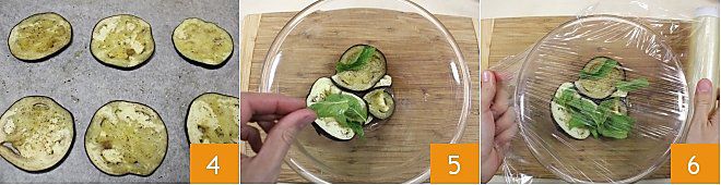Quand les tranches d'aubergine se seront ramollies et seront bien dorées 4, transférez-les dans un bol et assaisonnez-les avec des feuilles de menthe 5. Couvrez le bol avec un film plastique et laissez reposer pendant environ 5 minutes à température ambiante, afin qu'elles s'adoucissent davantage avec leur propre vapeur 6.